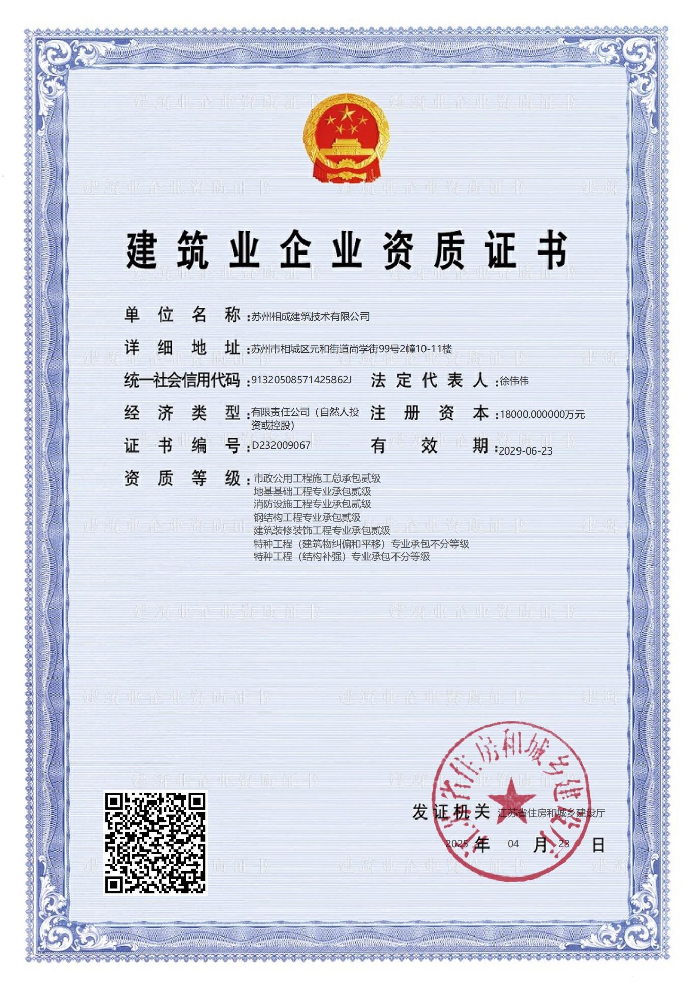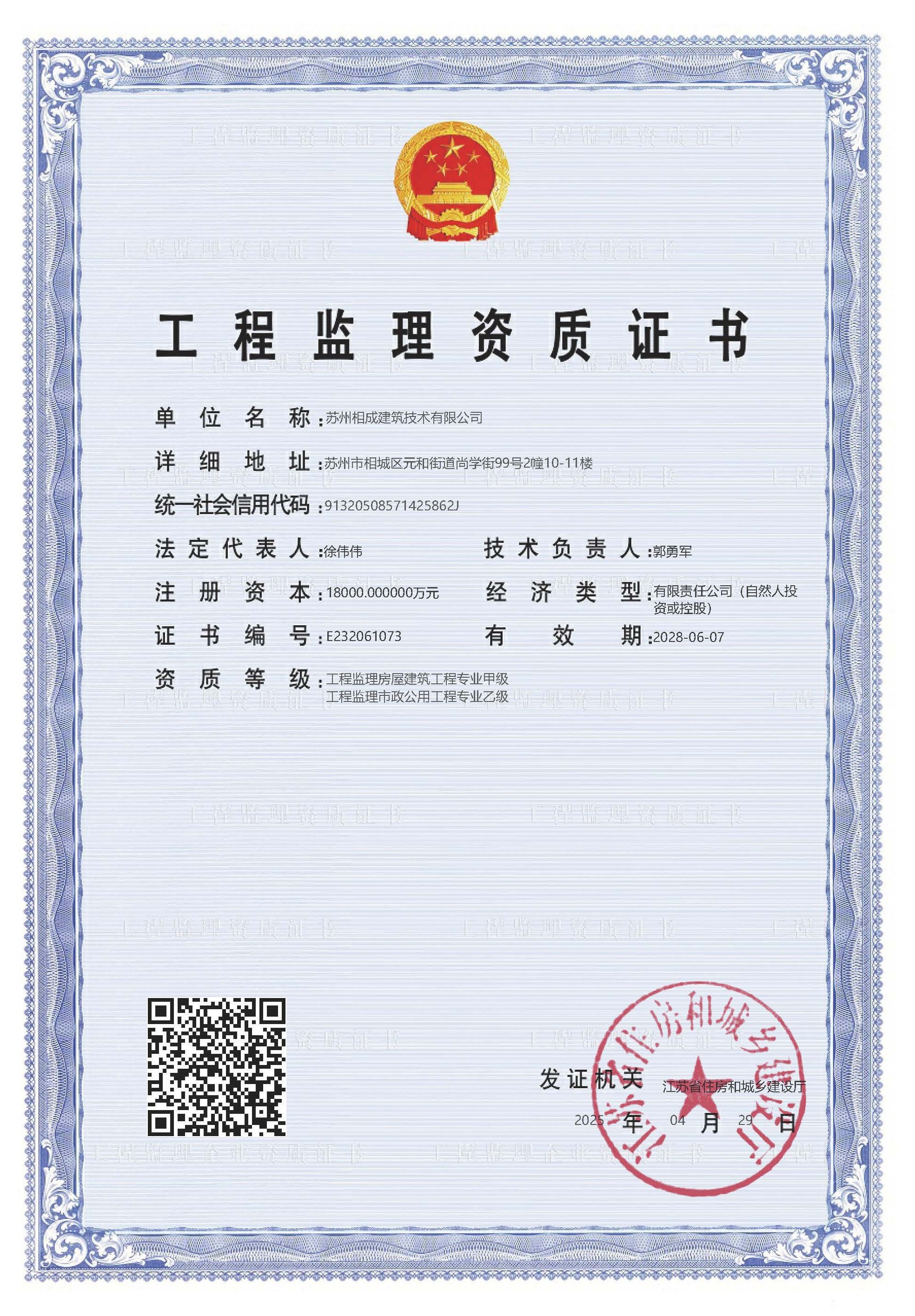 蘇州相成建筑技術有限公司是一家以提供建筑開發服務為主的建筑企業,公司位于蘇州市相城區,成立于2011年3月,注冊資本 10000萬,歷經13年的努力于2022年7月獲省住建廳頒發房屋建筑工程施工總承包壹級資質,市政公用、建筑裝飾、地基基礎、消防設施、鋼結構工程等專業承包二級資質; 2023 年6月份增設房屋建筑工程監理甲級、市政一級監理資質;目前是相城區唯一一家集施工總承包一級和建筑工程監理甲級資質的企業。